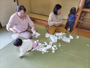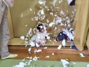 子どもたちの頭上や空中に放り投げて、雪を降らして遊びます。