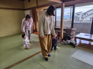 寝そべった子どもの身体の上をトコトコ歩かせたり、かくれんぼしたり、いないいないばあなどいろいろな遊びが楽しめます。