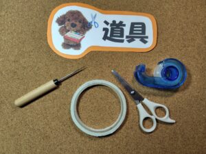 2.帽子用のカップに千枚通しで穴をあけ、ハサミの先でひもが通る