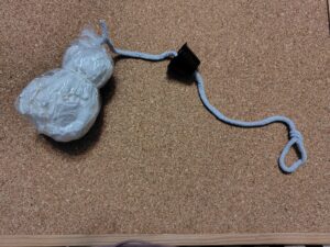 1.ビニール袋に紙片を入れて、雪だるまのウエスト部分に輪ゴムで