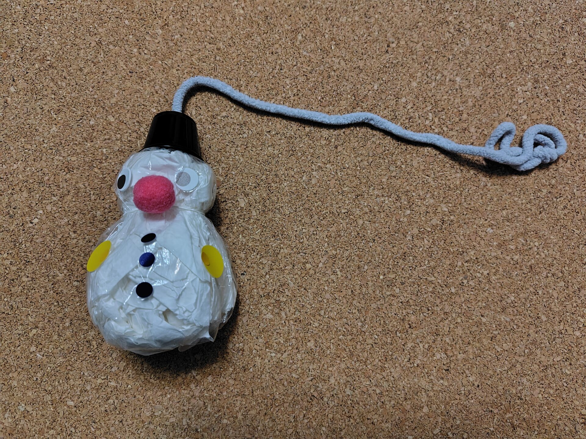ひもの長さは子どもが手で持った時に雪だるまのお尻が床につく
