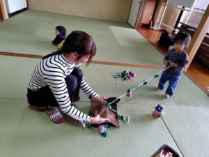葉っぱのついたつると畑を親子で引っ張り合って、さつまいも掘りごっこを