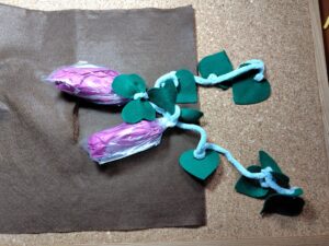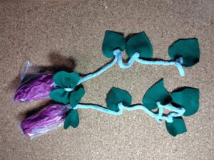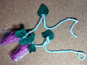 ひもの輪の中にちょうちょ型の緑のフェルトを通し、ひもを絞ります。